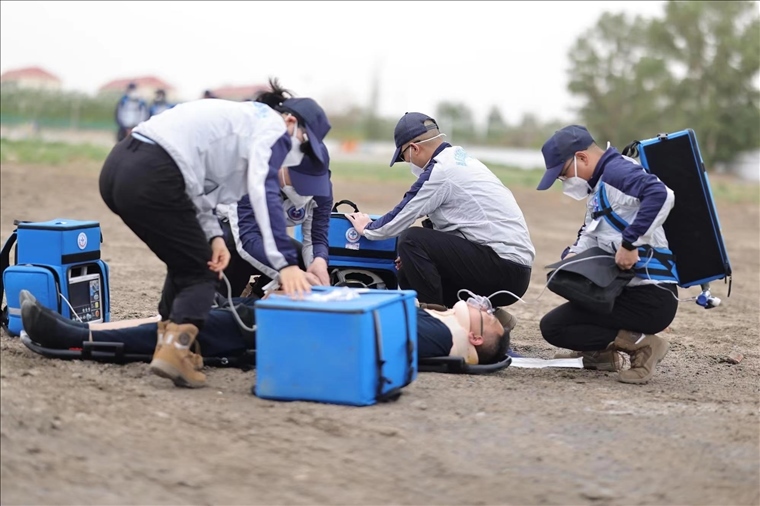 他們首先將模擬航天員抬到鏟式擔架上,迅速作出病情判斷后,立即護送進入救護直升機??紫殄|發(fā)出指令,趙琳輸送氧氣,朱明開始心電監(jiān)測,高曉佩建立靜脈通道……。經(jīng)初步驗傷,按照原定救治程序展開急救……演習于第二天上午10時結(jié)束,返回駐地,大家立刻顧不上休整,又迅速對演練進行復盤。