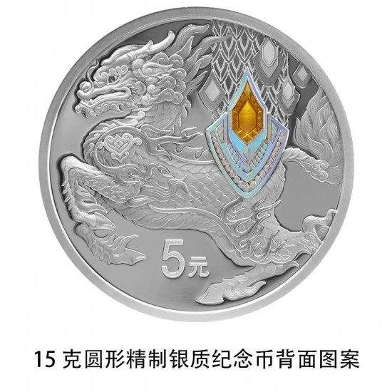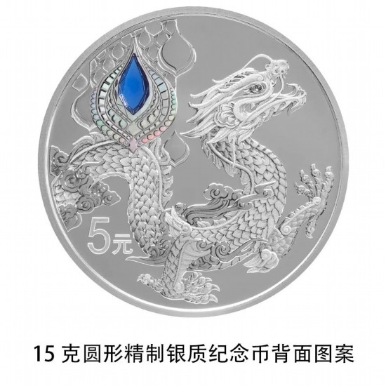 15克圓形銀質紀念幣背面圖案為龍造型,并刊面額。