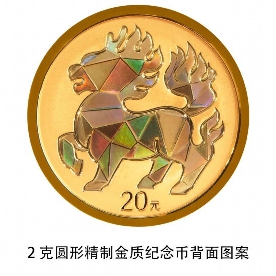 2克圓形金質紀念幣背面圖案為裝飾麒麟造型,并刊面額。