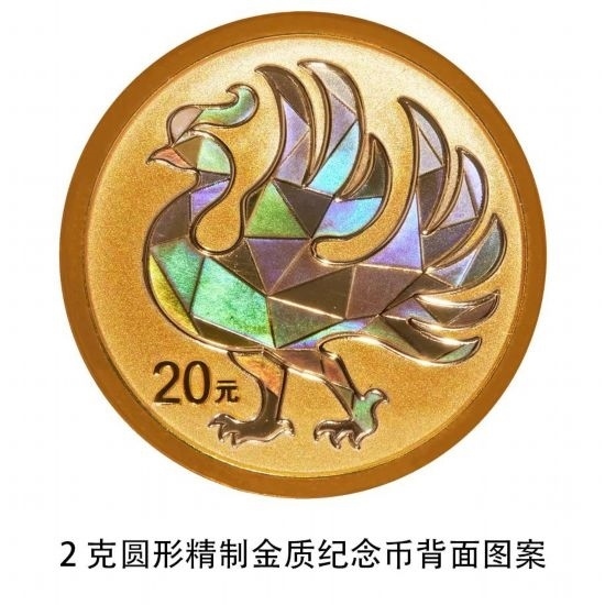 2克圓形金質紀念幣背面圖案為裝飾鳳凰造型,并刊面額。