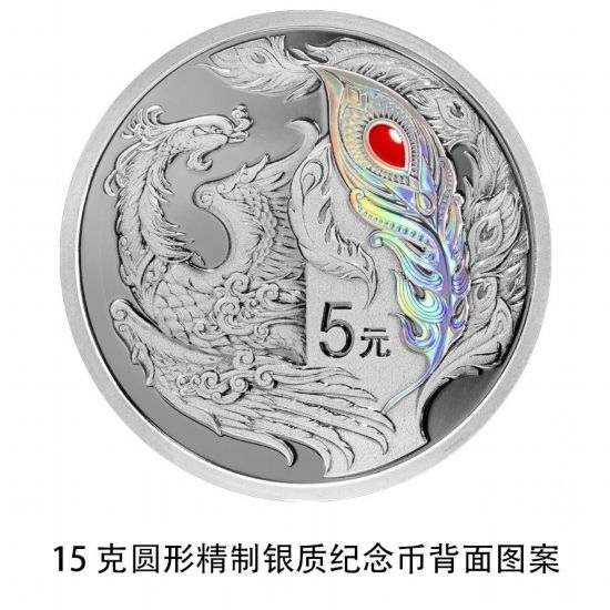 15克圓形銀質紀念幣背面圖案為鳳凰造型,并刊面額。
