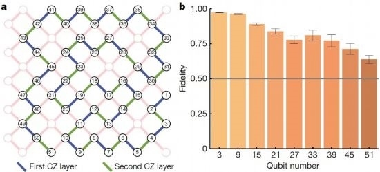 利用“祖沖之二號”完成的51比特一維簇態(tài)制備的線路及量子態(tài)保真度結(jié)果。(研究團(tuán)隊(duì)供圖)