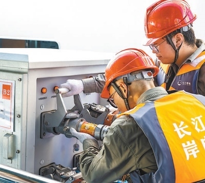 國(guó)網(wǎng)宜昌供電公司岸電運(yùn)維人員為靠泊船舶接通岸電。鄭家裕攝