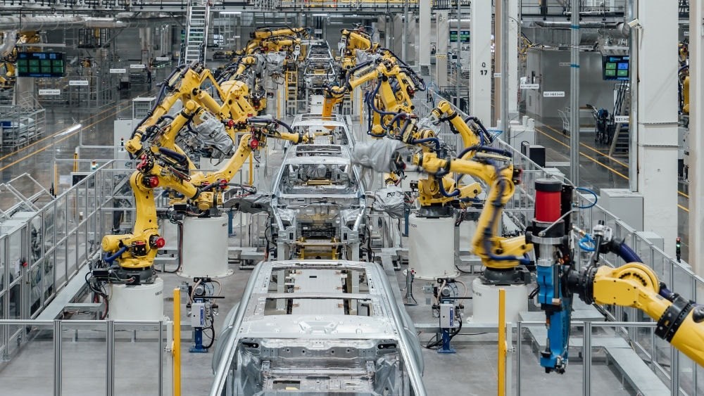 這是在重慶市兩江新區(qū)拍攝的賽力斯汽車超級工廠焊裝車間生產線(2024年2月26日攝,無人機照片)。新華社發(fā)(高彰 攝)