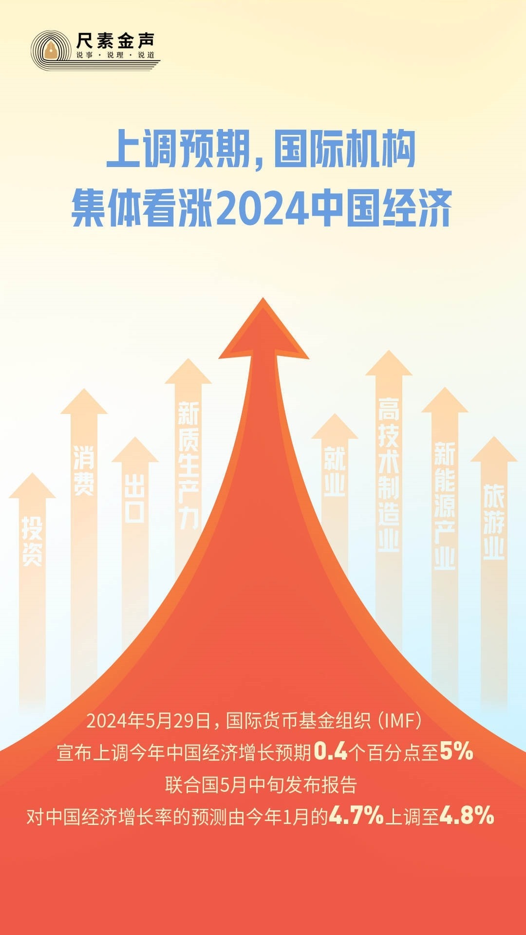 5月29日,國際貨幣基金組織(IMF)宣布上調(diào)今年中國經(jīng)濟(jì)增長預(yù)期0.4個(gè)百分點(diǎn)至5%。聯(lián)合國5月中旬發(fā)布報(bào)告,對中國經(jīng)濟(jì)增長率的預(yù)測由今年1月的4.7%上調(diào)至4.8%。4月以來,亞洲開發(fā)銀行、摩根士丹利、高盛、瑞銀等國際金融機(jī)構(gòu)紛紛上調(diào)對中國經(jīng)濟(jì)增速的全年預(yù)期。