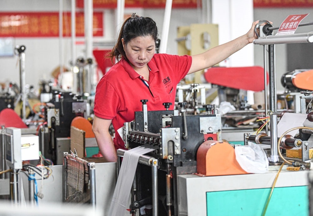 工作人員在??谡\佳美塑料包裝有限公司車間生產(chǎn)全生物降解袋(2020年11月4日攝)。新華社記者 蒲曉旭 攝
