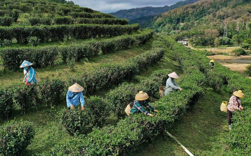 農(nóng)民在五指山椰仙茶園采茶(無人機照片,2024年1月11日攝)。新華社記者 郭程 攝