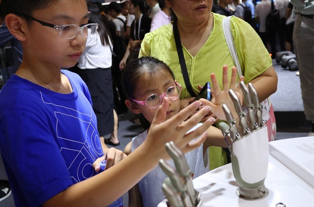 7月5日,在2024世界人工智能大會,小朋友在傲意科技機(jī)器人靈巧手展品旁參觀。新華社記者 方喆 攝