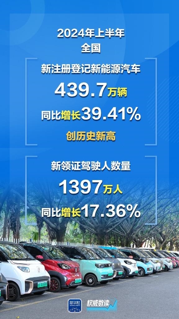 公安部7月8日發(fā)布最新統(tǒng)計數(shù)據(jù),截至2024年6月底,全國機動車保有量達4.4億輛,機動車駕駛?cè)?.32億人;上半年新注冊登記新能源汽車439.7萬輛,同比增長39.41%,創(chuàng)歷史新高;上半年全國新領(lǐng)證駕駛?cè)藬?shù)量1397萬人。