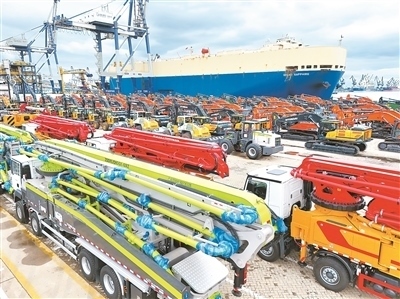 10月14日,國(guó)產(chǎn)工程機(jī)械在山東港口煙臺(tái)港集結(jié)等待裝船出口。唐 克攝(人民視覺)
