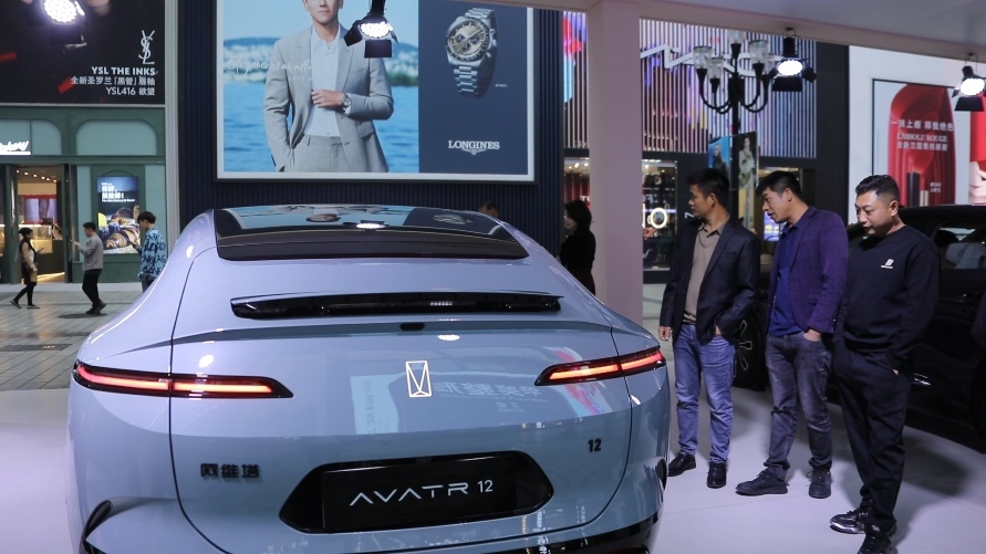 新上市的新能源汽車長安阿維塔12雙動(dòng)力車型吸引往來游客。新華社記者趙小帥 攝