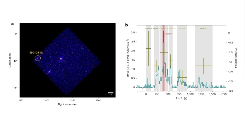 此后,世界各地多個(gè)天文望遠(yuǎn)鏡陸續(xù)觀測(cè)到EP240315a。研究結(jié)果表明,EP240315a產(chǎn)生于遙遠(yuǎn)的早期宇宙,當(dāng)時(shí)宇宙年齡僅為現(xiàn)在的10%,EP240315a的信號(hào)花費(fèi)了125億年才抵達(dá)地球。