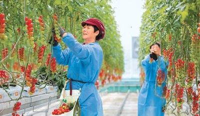 近年來,江蘇省南通市通州區(qū)大力推動(dòng)智慧設(shè)施農(nóng)業(yè)、生態(tài)高效農(nóng)業(yè)園區(qū)發(fā)展,促進(jìn)農(nóng)業(yè)生產(chǎn)提質(zhì)增效。圖為通州區(qū)十總鎮(zhèn)圓宏萬嘉智慧農(nóng)業(yè)基地的智能大棚內(nèi),工人在采摘成熟的小番茄。