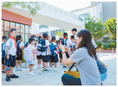 雄安史家胡同小學(xué)校門(mén)口,家長(zhǎng)在送孩子上學(xué)。