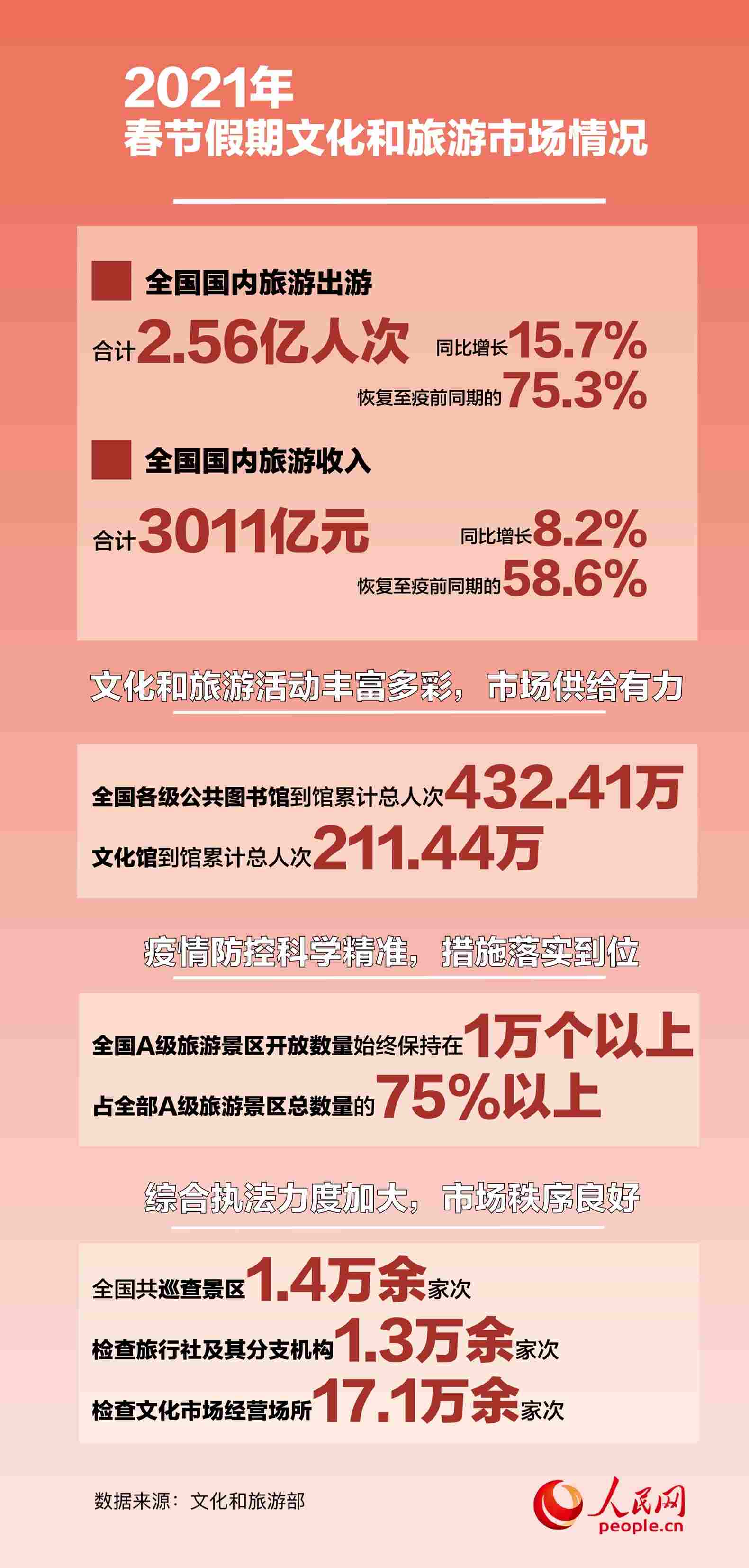 人民網(wǎng)北京2月25日電 (白帆)2月25日,文化和旅游部發(fā)布了2021年春節(jié)假期文化和旅游市場(chǎng)情況。數(shù)據(jù)顯示,綜合各地文化和旅游部門、通訊運(yùn)營商、線上旅行服務(wù)商的數(shù)據(jù),經(jīng)文化和旅游部數(shù)據(jù)中心測(cè)算,春節(jié)假期七天,全國國內(nèi)旅游出游合計(jì)2.56億人次,同比增長15.7%,恢復(fù)至疫前同期的75.3%。實(shí)現(xiàn)國內(nèi)旅游收入3011億元,同比增長8.2%,恢復(fù)至疫前同期的58.6%。