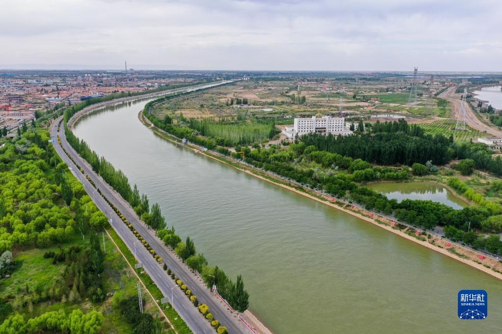 這是三盛公水利樞紐旁的黃河干渠(無(wú)人機(jī)照片,6月6日攝)。