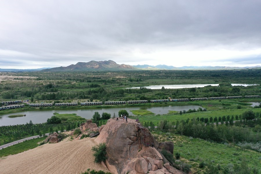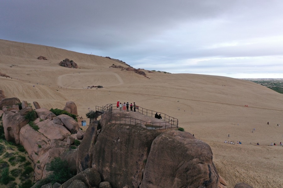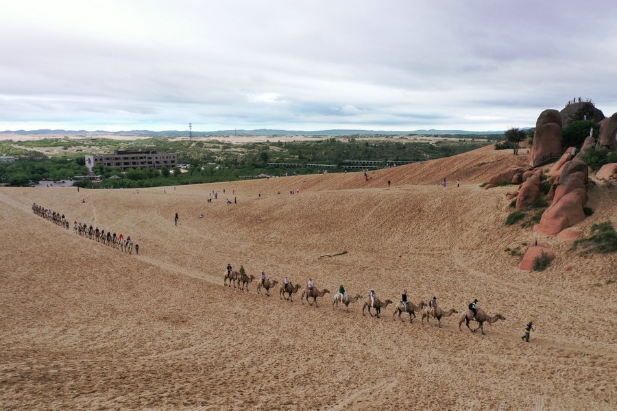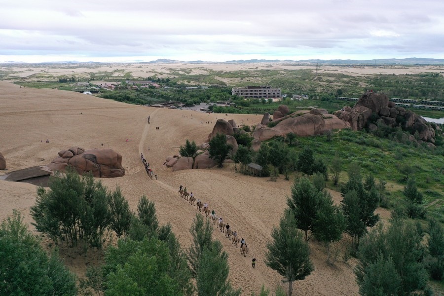 7月31日,雨后的玉龍沙湖空氣清新,游客在玉龍沙湖景區(qū)越野穿沙、騎駱駝?dòng)瓮妫蕾p沙海奇觀。
