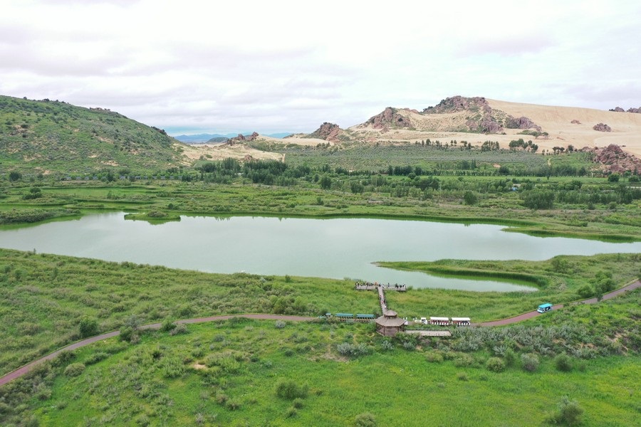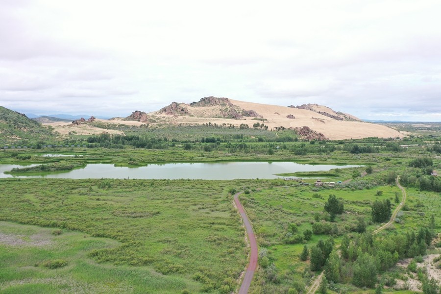 玉龍沙湖位于內(nèi)蒙古赤峰市翁牛特旗,這里集沙漠、怪石、古樹(shù)、奇峰、草原、湖泊、濕地等于一身,5萬(wàn)畝草原與茫茫的科爾沁沙地相連,綠洲掩映,湖光山色,形成沙海相連的奇特景觀。