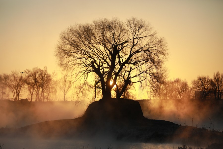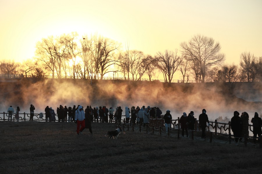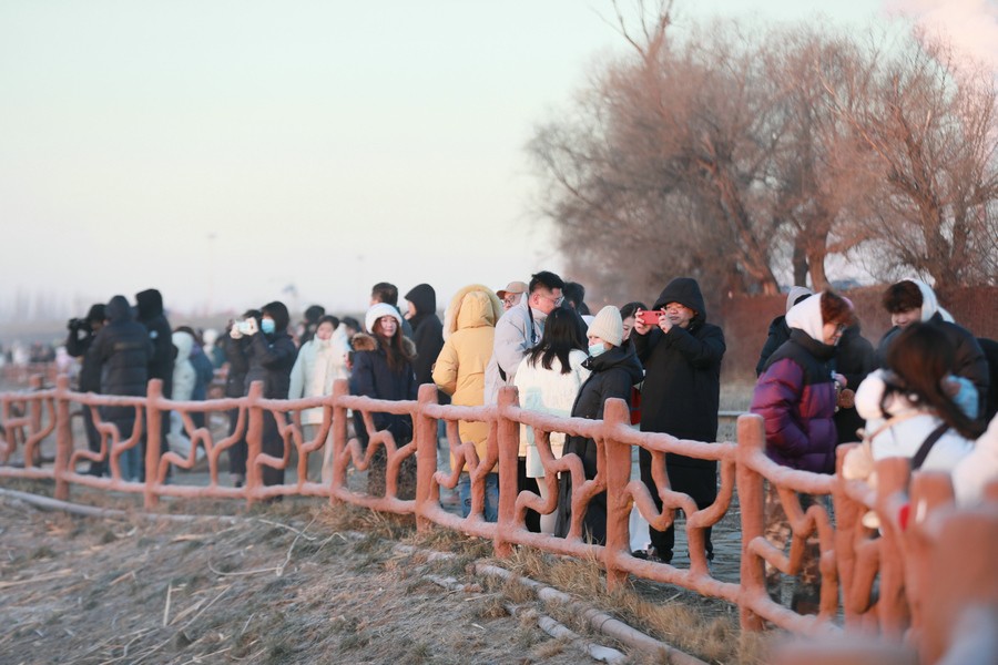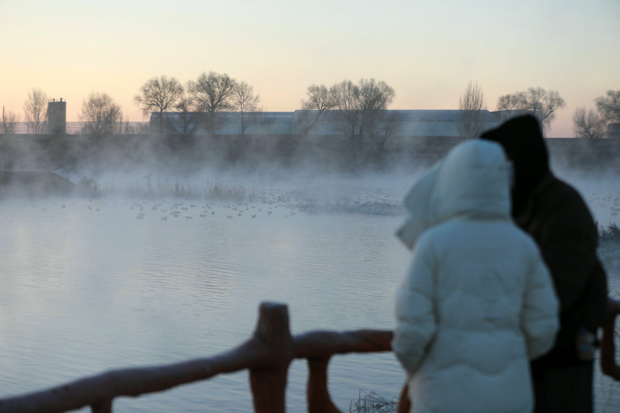 12月15日清晨,上千名游人在呼和浩特玉泉區(qū)班定營村南側(cè)的塞外“千島湖”畔賞景打卡。此處湖水為城市污水經(jīng)處理達(dá)標(biāo)后的再生水,隆冬時(shí)節(jié),再生水流入湖中,水汽蒸騰,岸邊草木霧凇皚皚,良好的生態(tài)吸引了數(shù)萬只赤麻鴨在此翔集棲息,構(gòu)成一幅生動和諧的美麗畫面。每日清晨,都有上千名游客來此觀日出賞美景。