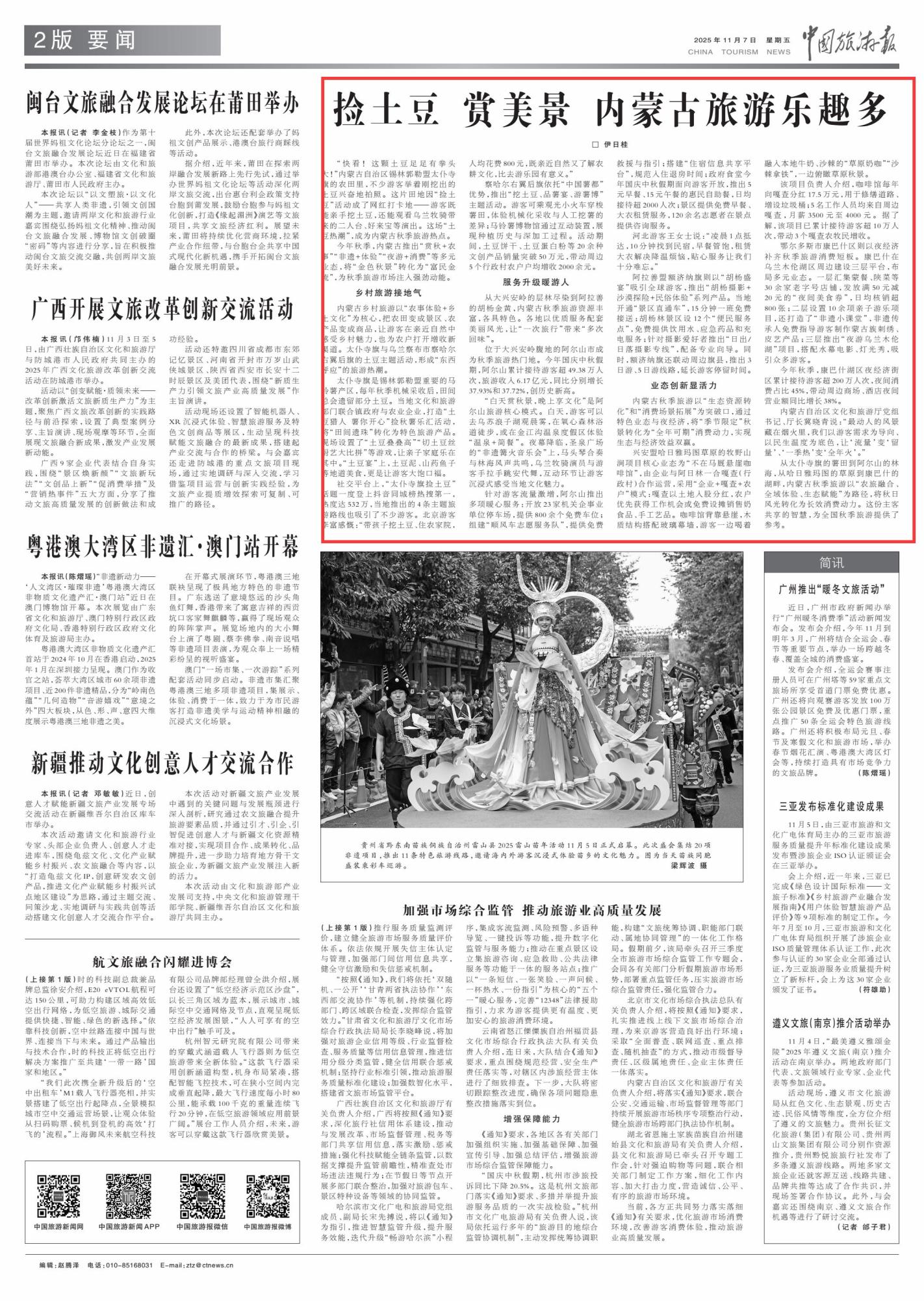 2025年11月7日《中國(guó)旅游報(bào)》第2版刊發(fā)了《撿土豆 賞美景 內(nèi)蒙古旅游樂(lè)趣多》的文章,報(bào)道了今年秋季,內(nèi)蒙古推出“賞秋+農(nóng)事”“非遺+體驗(yàn)”“夜游+消費(fèi)”等多元業(yè)態(tài),將“金色秋景”轉(zhuǎn)化為“富民金流”,為秋季旅游市場(chǎng)注入強(qiáng)勁動(dòng)能。