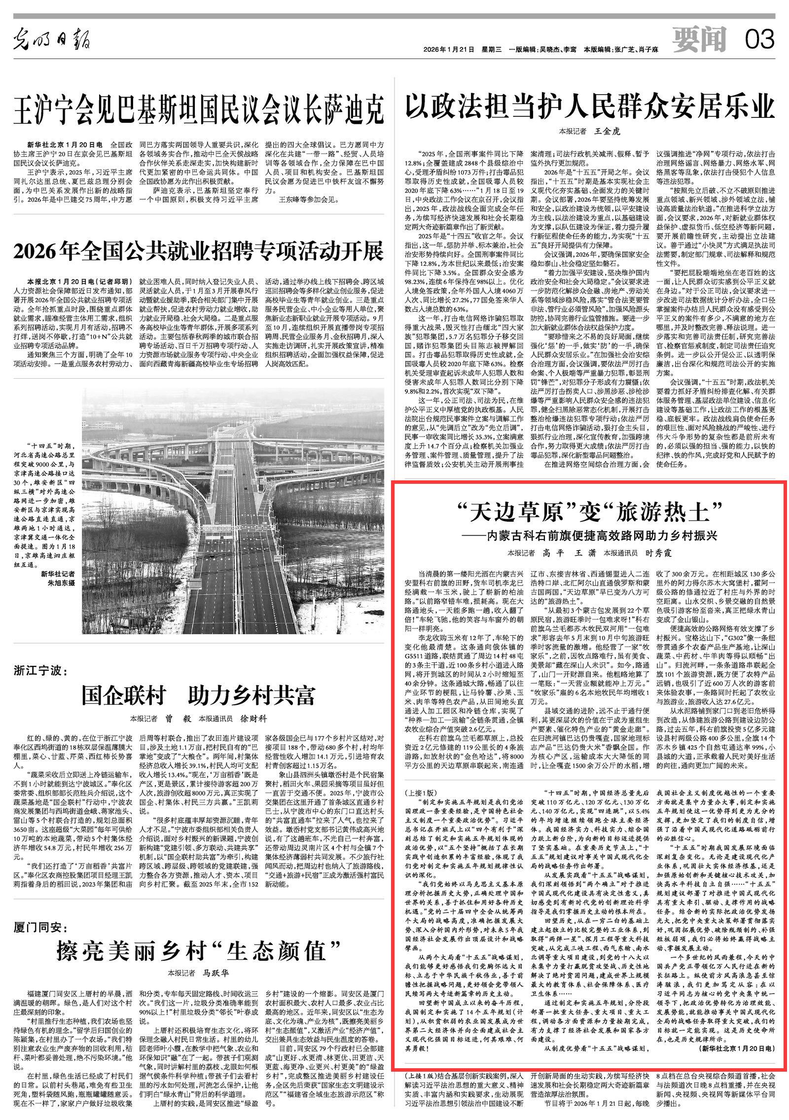 2026年1月21日《光明日報》第3版刊發(fā)了《“天邊草原”變“旅游熱土”——內(nèi)蒙古科右前旗便捷高效路網(wǎng)助力鄉(xiāng)村振興》的文章,報道了過去五年,科右前旗投資5億多元建設(shè)縣村兩級公路400多公里,全旗14個蘇木鄉(xiāng)鎮(zhèn)425個自然屯通達(dá)率99%,小縣城的大道,正承載著人民對美好生活的向往,通向更加廣闊的未來。