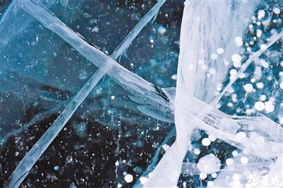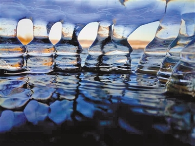 冰塊在夕陽(yáng)霞光的照耀下,變身冬日瑪瑙,晶瑩剔透,溢光流彩。潔凈的冰面像龜背一樣裂出美麗的紋理,與夜晚琥珀色的天空相映成趣,令人眩目,美妙無(wú)比?!∴崗V鑫 攝