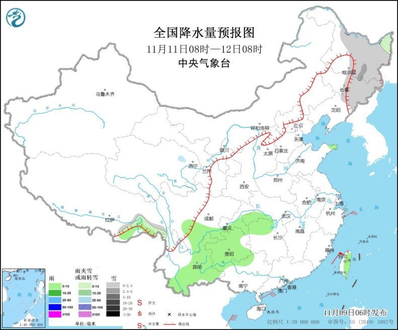 11月9日08時至10日08時,內(nèi)蒙古東北部、東北地區(qū)大部等地部分地區(qū)有小到中雪,其中,黑龍江中西部、吉林中部、遼寧北部等地部分地區(qū)有大到暴雪(10~13毫米)。黑龍江東北部、川西高原北部、四川南部、貴州西南部、云南大部、臺灣島大部等地部分地區(qū)有小雨。內(nèi)蒙古河套地區(qū)和中部、東北地區(qū)西部、黃淮東部、江南東北部等地部分地區(qū)有4~6級風(fēng),其中,西藏北部部分地區(qū)有6~7級風(fēng)。