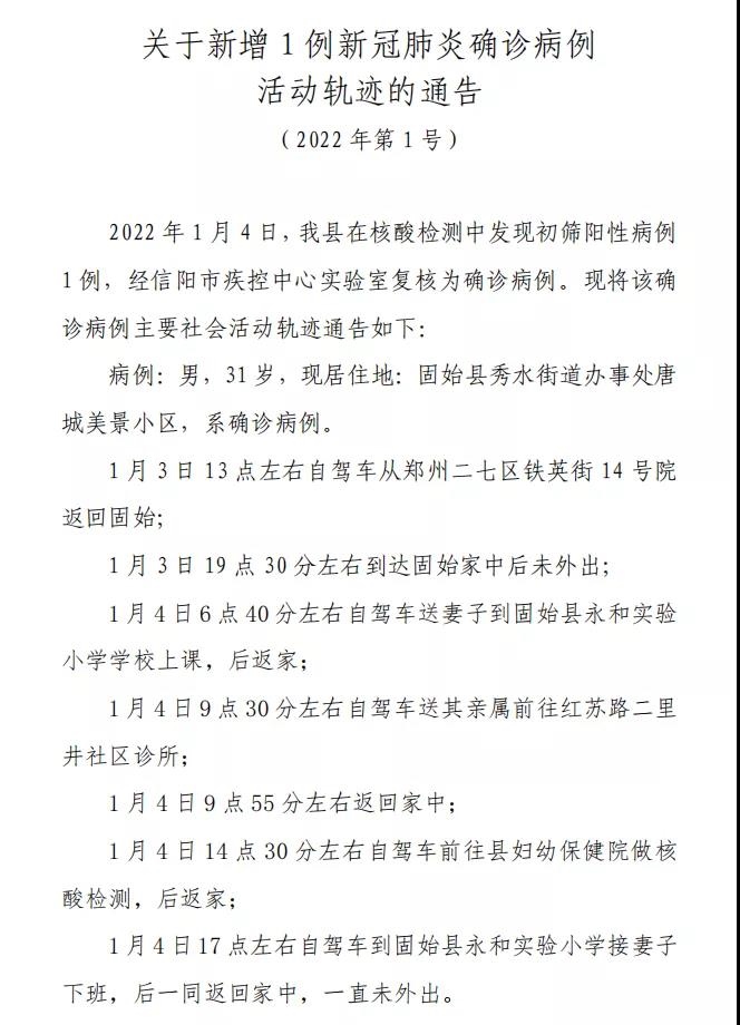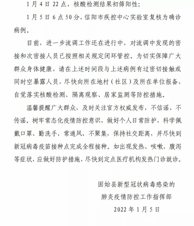 據(jù)固始縣委宣傳部微信公眾號消息,1月4日,河南固始縣在核酸檢測中發(fā)現(xiàn)初篩陽性病例1例,經(jīng)信陽市疾控中心實驗室復核為確診病例。