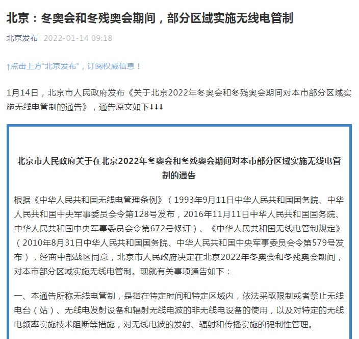 根據(jù)《中華人民共和國無線電管理條例》《中華人民共和國無線電管制規(guī)定》,經(jīng)商中部戰(zhàn)區(qū)同意,北京市人民政府決定在北京2022年冬奧會和冬殘奧會期間,對本市部分區(qū)域?qū)嵤o線電管制。具體有關(guān)事項通告如下: