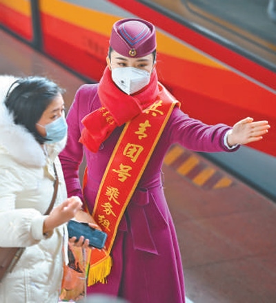 春運(yùn)首日,成渝高鐵“復(fù)興號”智能動車組“共青團(tuán)號”列車首發(fā),這是全國首次在“復(fù)興號”智能動車組中常態(tài)化開行“共青團(tuán)號”列車,列車將開展常態(tài)化志愿服務(wù)。圖為志愿者服務(wù)旅客乘車。