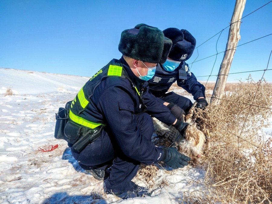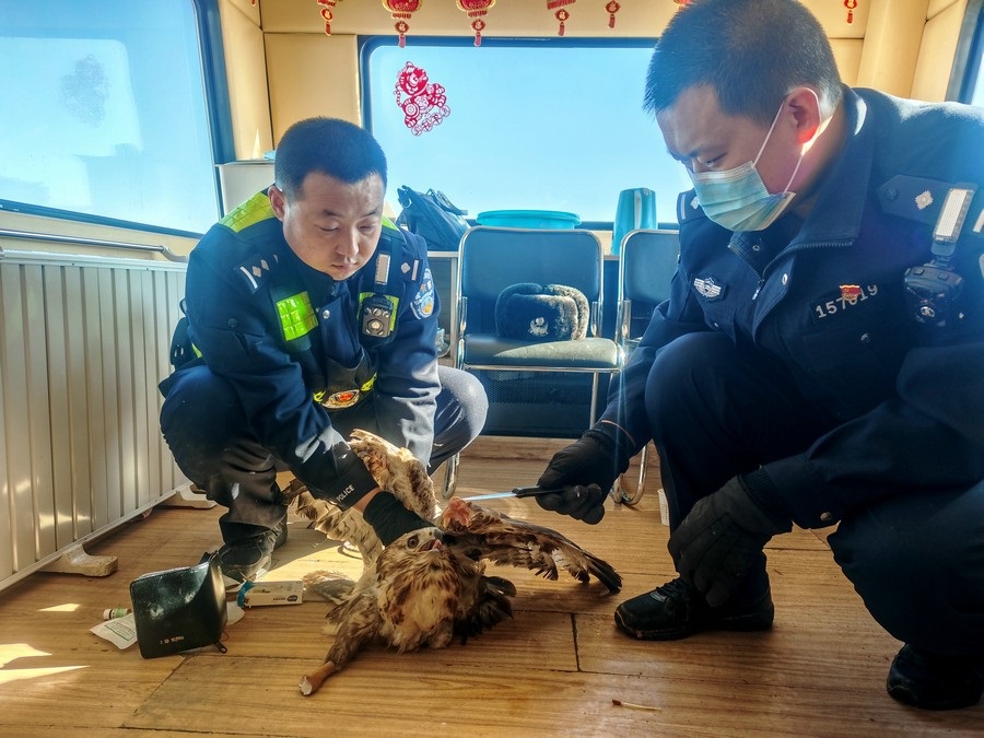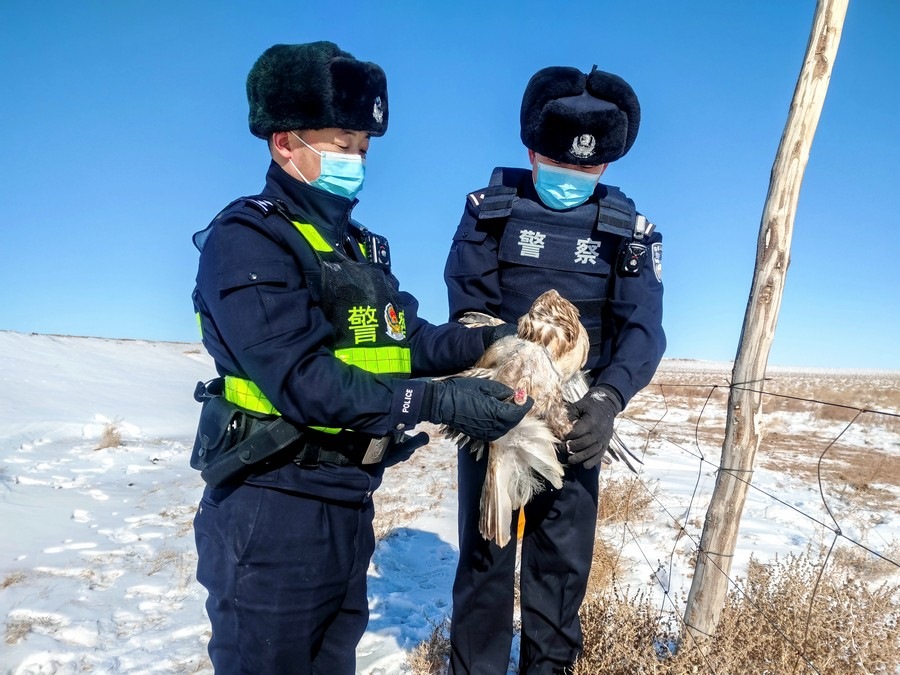 北疆新聞網(wǎng)、北疆新聞APP、北疆云消息(記者 劉嬙 通訊員 張路 張冬)2月10日,內(nèi)蒙古烏蘭察布市四子王旗腦木更邊境派出所民警在執(zhí)勤巡邏途中,發(fā)現(xiàn)一只“大鳥”被困在網(wǎng)圍欄上。民警靠近后仔細觀察發(fā)現(xiàn),這只“大鳥”在奮力撲打翅膀但無法飛行,右爪缺失,受傷嚴重。民警通過手機搜索網(wǎng)絡(luò)圖片比對,初步判定為國家二級保護動物鷹隼。