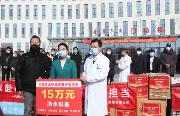 2月25日,由內(nèi)蒙古自治區(qū)工商聯(lián)組織,內(nèi)蒙古水處理設(shè)備行業(yè)協(xié)會聯(lián)合山東省凈水專委會,向內(nèi)蒙古第三醫(yī)院捐贈價值15萬凈水設(shè)備和100件蘇打水。當天,內(nèi)蒙古自治區(qū)黨委統(tǒng)戰(zhàn)部副部長、自治區(qū)工商聯(lián)黨組書記梁淑琴,內(nèi)蒙古自治區(qū)工商聯(lián)黨組成員白春艷,一級巡視員屈晨然、二級巡視員呂萬海、武軍等出席捐贈活動。