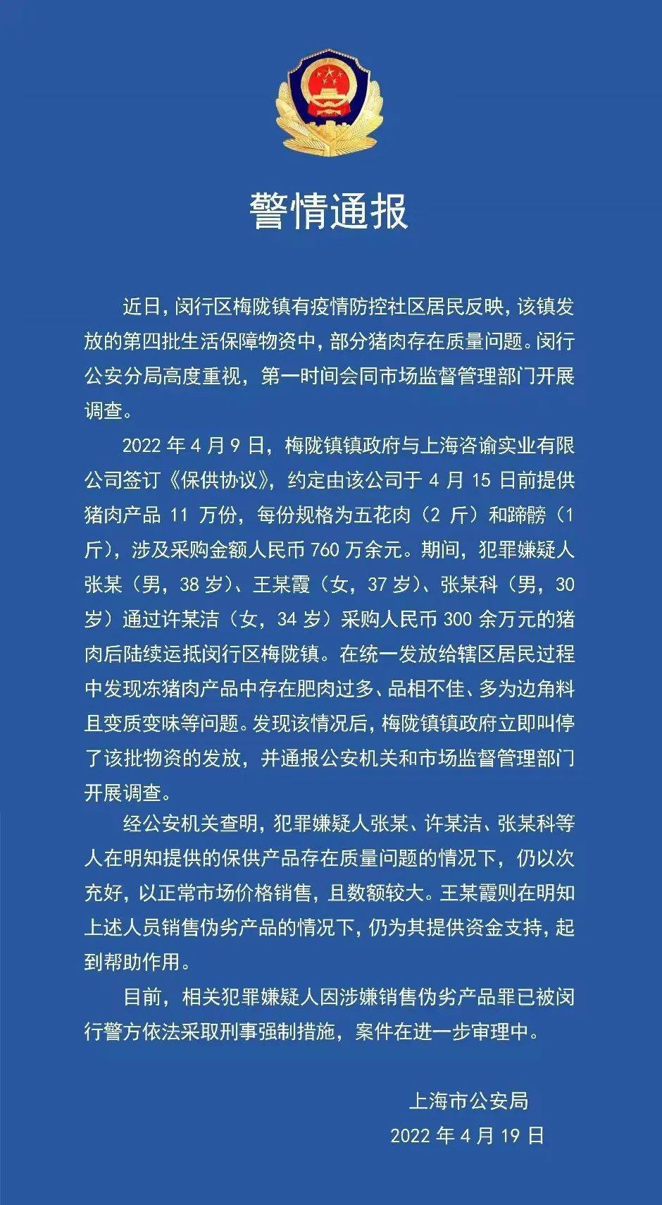 警方通報:2022年4月9日,梅隴鎮(zhèn)鎮(zhèn)政府與上海咨諭實業(yè)有限公司簽訂《保供協(xié)議》,約定由該公司于4月15日前提供豬肉產(chǎn)品11萬份,每份規(guī)格為五花肉(2斤)和蹄髈(1斤),涉及采購金額人民幣760萬余元。其間,犯罪嫌疑人張某(男,38歲)、王某霞(女,37歲)、張某科(男,30歲)通過許某潔(女,34歲)采購人民幣300余萬元的豬肉后陸續(xù)運抵閔行區(qū)梅隴鎮(zhèn)。在統(tǒng)一發(fā)放給轄區(qū)居民過程中發(fā)現(xiàn)凍豬肉產(chǎn)品中存在肥肉過多、品相不佳、多為邊角料且變質(zhì)變味等問題。發(fā)現(xiàn)該情況后,梅隴鎮(zhèn)鎮(zhèn)政府立即叫停了該批物資的發(fā)放,并通報公安機關和市場監(jiān)督管理部門開展調(diào)查。