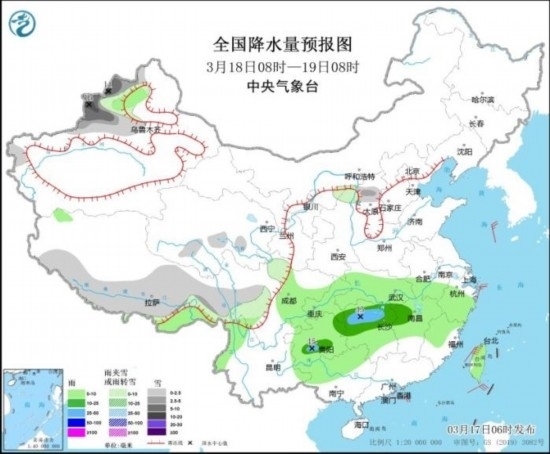 全國降水量預報圖(3月17日08時-18日08時)