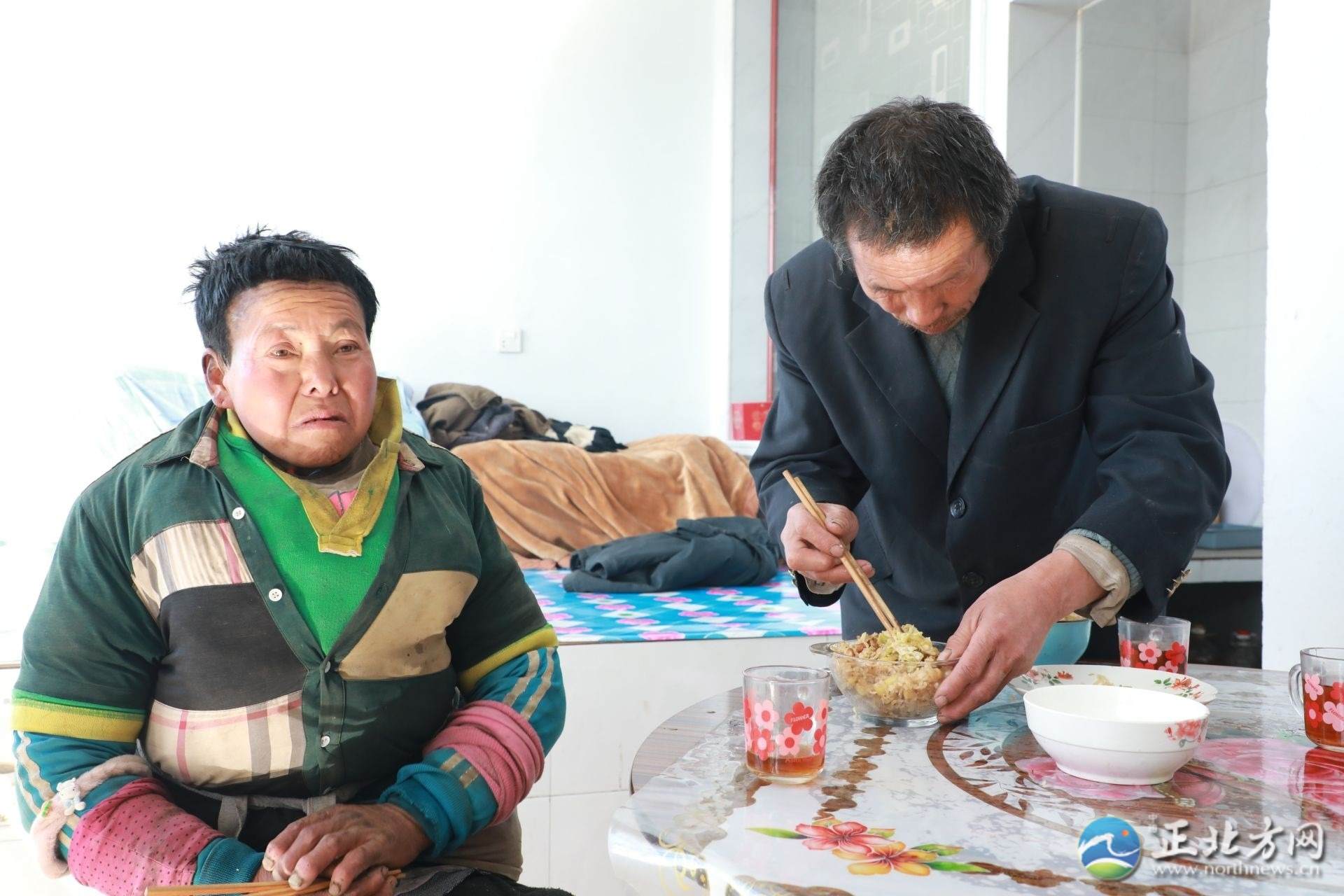 在采訪間隙,何蘭鎖的妻子王林愛回到了家,見到有陌生人顯得很局促。王林愛患有精神疾病,說話顛三倒四。何蘭鎖拿起毛巾,溫柔地為妻子擦拭沾滿灰塵的臉和手,端出早早做好的飯放在桌上:“快吃吧,有你最愛吃的咸菜?!薄傲謵燮鋵嵜羁嗔?,啥也懂不得,我要不在了,她一個人可咋辦呀。我現(xiàn)在最大的心愿是希望能讓她去接受治療?!焙翁m鎖止不住地哽咽道。