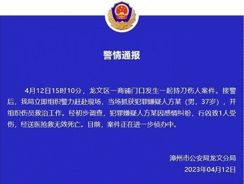 ·漳州公安通報(bào)萬(wàn)達(dá)砍人案:男子因感情糾紛行兇致一人死亡,被當(dāng)場(chǎng)抓獲。