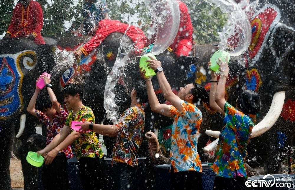 當(dāng)?shù)貢r(shí)間2023年4月11日,泰國(guó)大城府,大象與游客相互潑水,歡度潑水節(jié)。