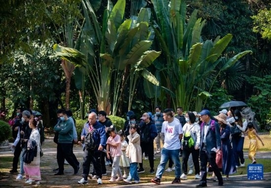 游客在位于云南省西雙版納州勐臘縣勐侖鎮(zhèn)的中國科學院西雙版納熱帶植物園內(nèi)游覽(2023年2月12日攝)。