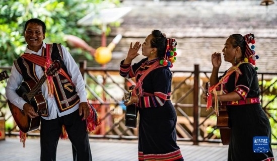 在云南省普洱市瀾滄拉祜族自治縣老達保村,致富帶頭人、拉祜族村民李娜倮(中)帶領(lǐng)村民演出(2022年7月5日攝)。