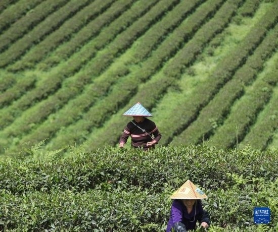4月15日,貴州省開(kāi)陽(yáng)縣南龍鄉(xiāng)東官村一生態(tài)茶園,茶農(nóng)在采摘春茶。