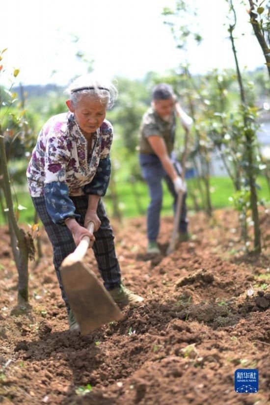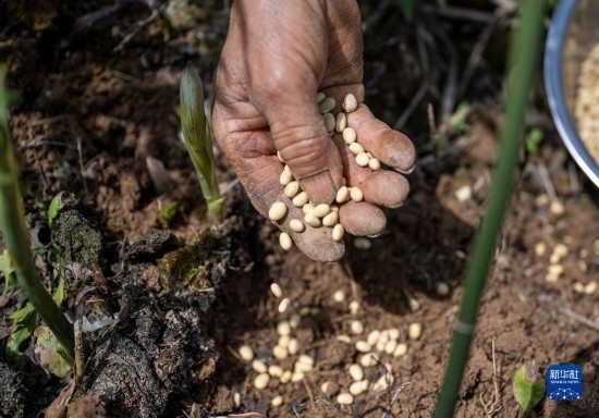 4月15日,村民在貴州省開(kāi)陽(yáng)縣南龍鄉(xiāng)中橋村中藥材種植基地套種黃豆。