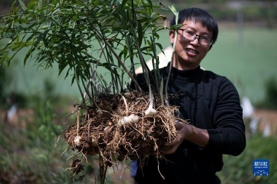 4月15日,村民在貴州省開(kāi)陽(yáng)縣南龍鄉(xiāng)中橋村中藥材種植基地展示采收的黃精。