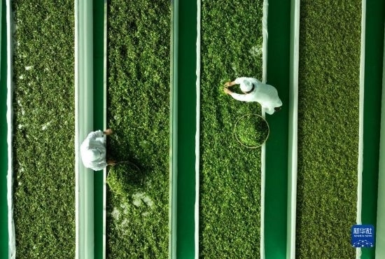 4月15日,在貴州省開(kāi)陽(yáng)縣南龍鄉(xiāng)翁朵村一茶葉加工廠,工人在攤晾茶青(無(wú)人機(jī)照片)。