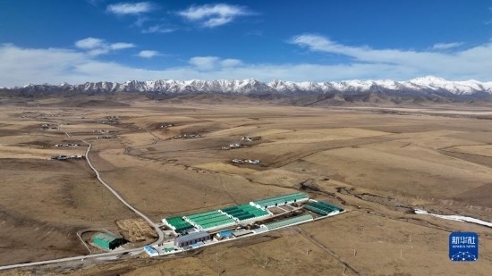 4月16日在青海省海北藏族自治州門源回族自治縣皇城蒙古族鄉(xiāng)拍攝的養(yǎng)殖畜棚(無人機(jī)照片)。