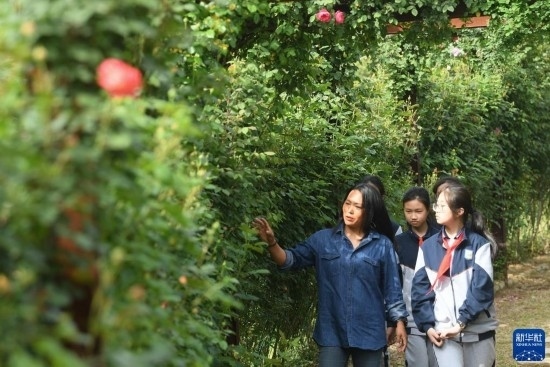 4月20日,玫瑰莊園的創(chuàng)始人季梅(左一)向前來(lái)研學(xué)的中學(xué)生介紹玫瑰品種。