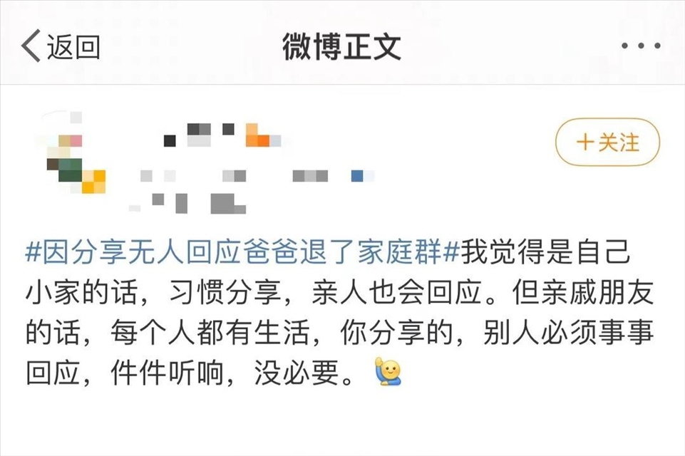 日前,一則“因分享無人回應爸爸退了家庭群”的話題引發(fā)公眾關(guān)注,登上熱搜。