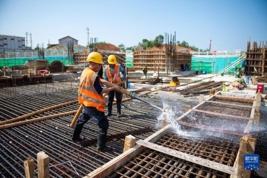 5月3日,在長沙西站建設(shè)工地,工人做混凝土澆筑前準(zhǔn)備。