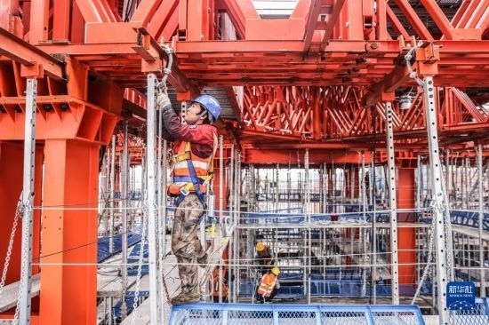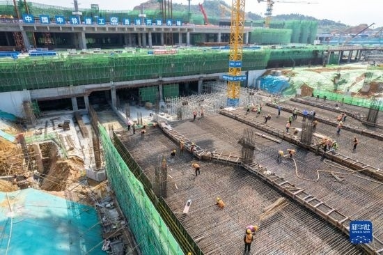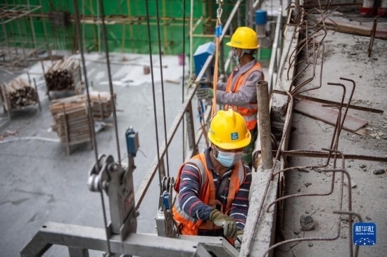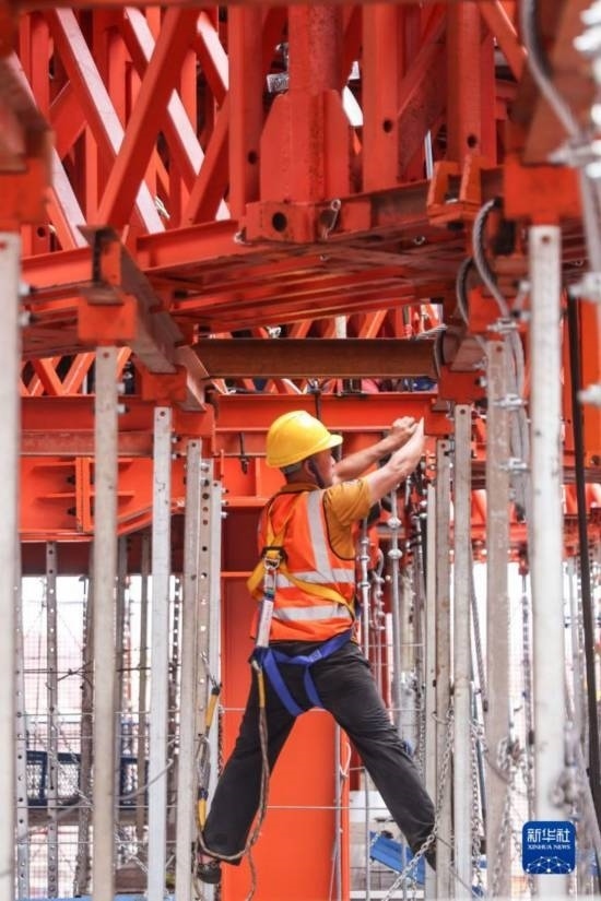 5月3日,中建三局的工人在海南中心項目的“空中造樓機”內(nèi)施工。