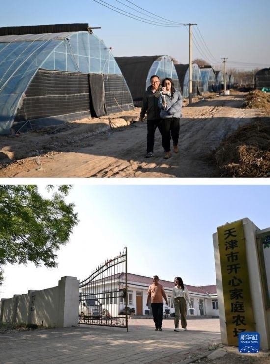 拼版照片:上圖為呂欣和丈夫馮愛喜通過直播介紹自家種植藍(lán)莓的大棚(2022年12月6日攝);下圖為呂欣和丈夫馮愛喜一起走出家庭農(nóng)場(chǎng)(5月3日攝)。