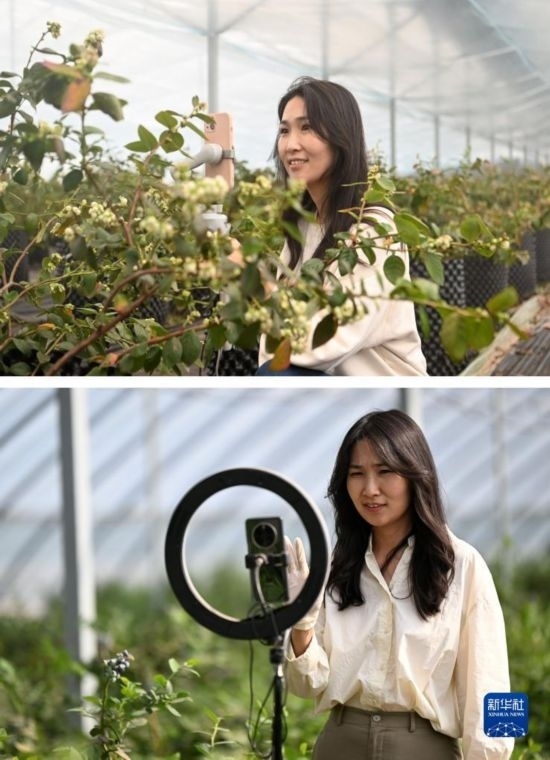拼版照片:上圖為呂欣在大棚里用手機(jī)拍攝介紹處在花期的藍(lán)莓(1月11日攝);下圖為呂欣在大棚里通過直播介紹已進(jìn)入采摘期的藍(lán)莓(5月3日攝)。